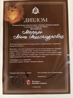 Член Курской областной общественной организации Анна Морарь стала обладателем Всероссийской премии «Человек с большим сердцем». Церемония вручения прошла 22 ноября в Москве.