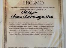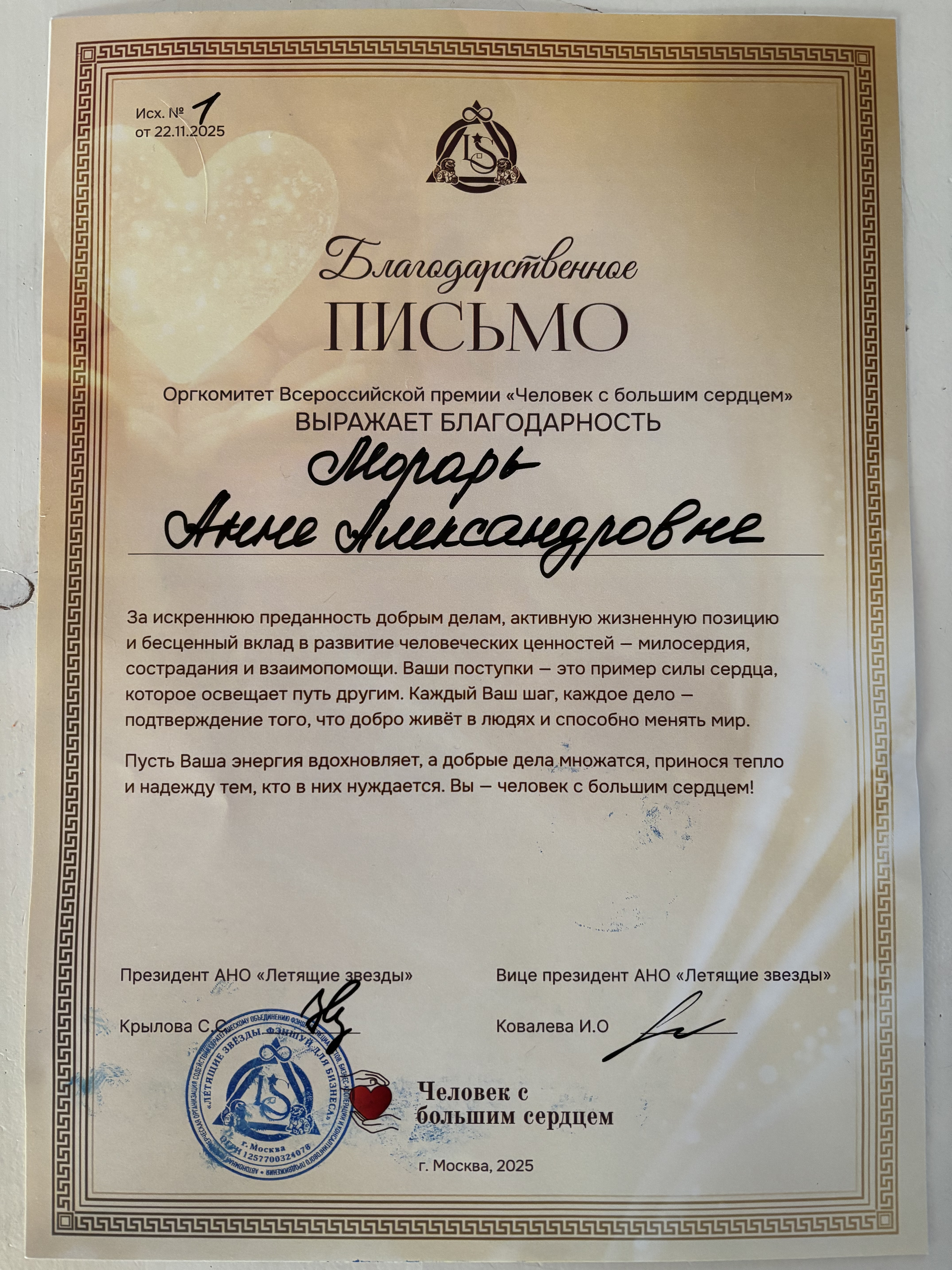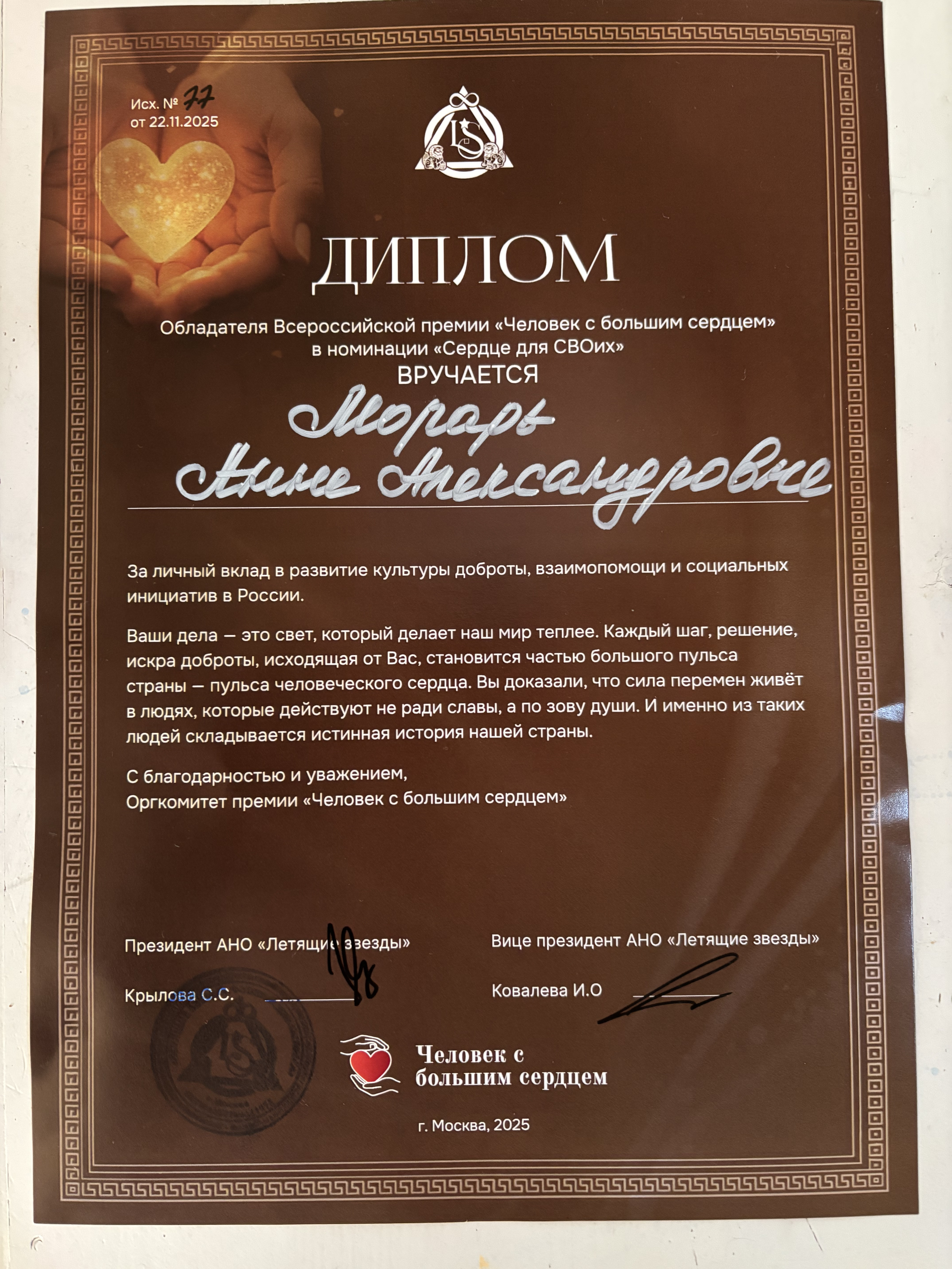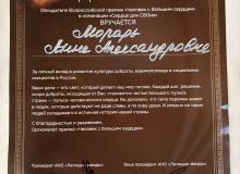 Обладателем Всероссийской премии «Человек с большим сердцем», прошедшей в Москве 22 ноября 2025 года, стала Анна Морарь - член Курской областной общественной организации ВОС